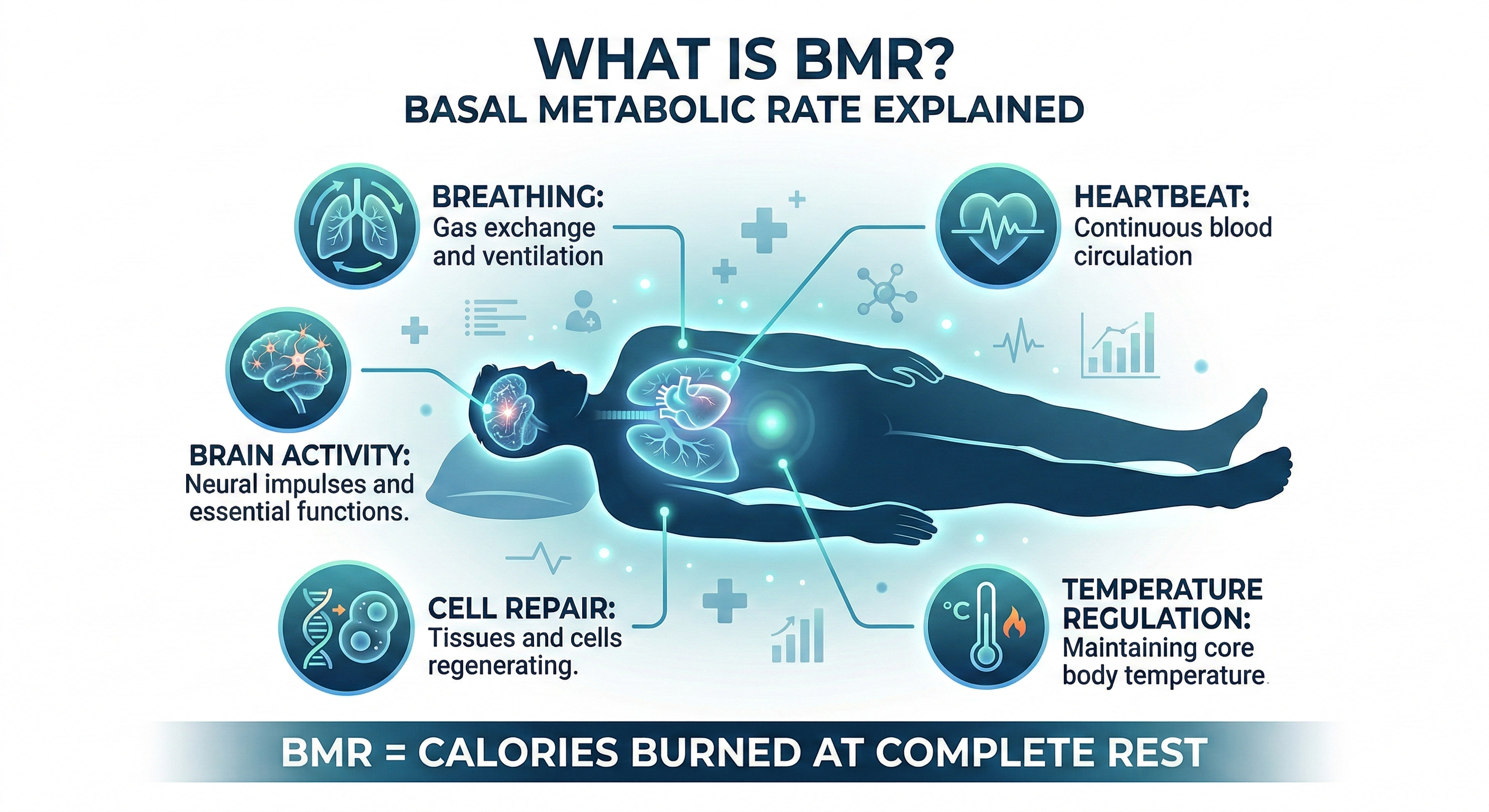 Your basal metabolic rate (BMR) is the number of calories your body burns at complete rest to maintain essential life-sustaining functions: